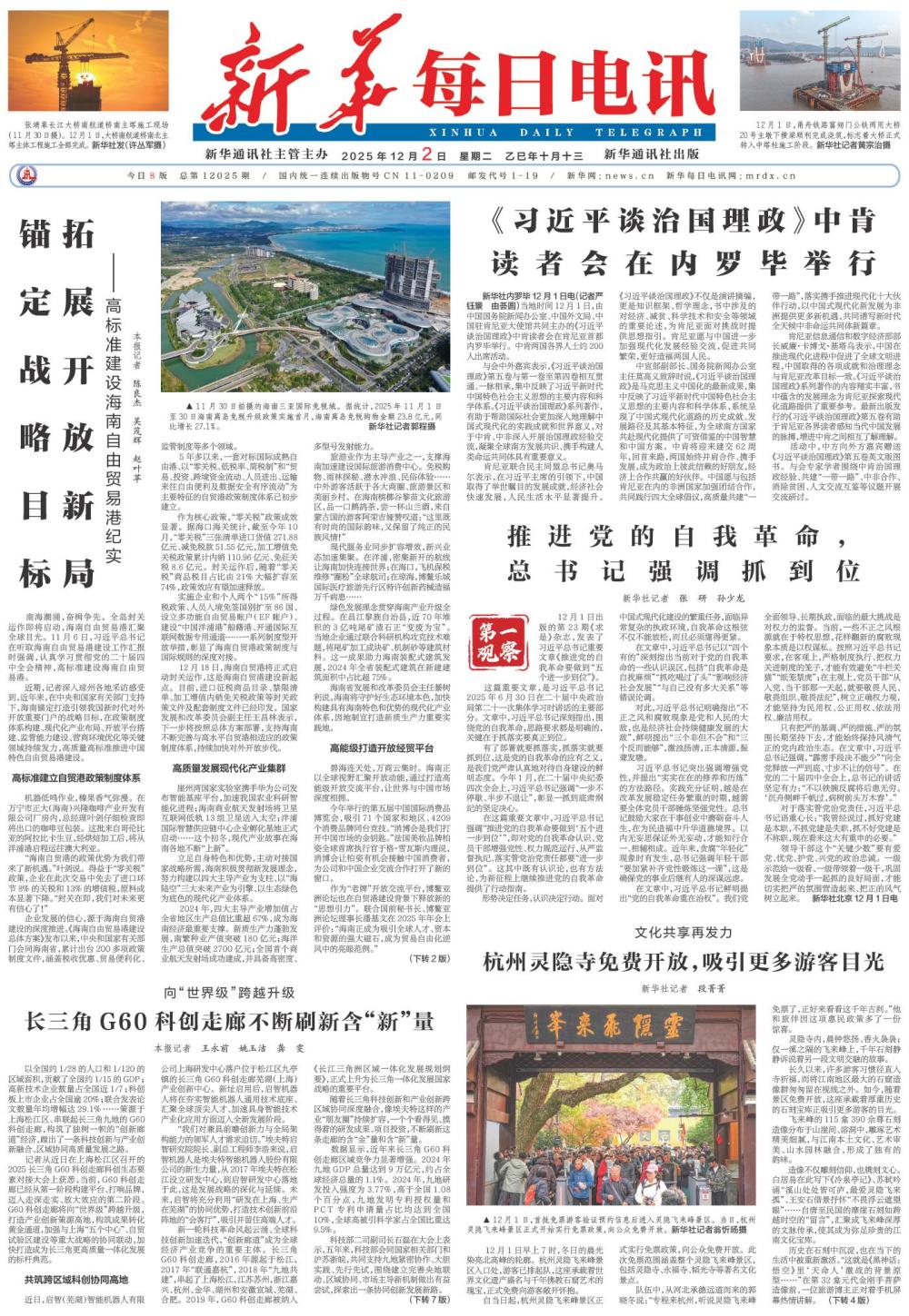来源:12月2日《新华每日电讯》 作者:新华每日电讯记者陈良杰 吴茂辉 赵叶苹 南海潮涌,奋楫争先。全岛封关运作即将启动,海南自由贸易港汇聚全球目光。11月6日,习近平总书记在听取海南自由贸易港建设工作汇报时强调,认真学习贯彻党的二十届四中全会精神,高标准建设海南自由贸易港。 近期,记者深入琼州各地采访感受到,近年来,在中央和国家有关部门支持下,海南锚定打造引领我国新时代对外开放重要门户的战略目标,在政策制度体系构建、现代化产业布局、开放平台搭建、监管能力建设、营商环境优化等关键领域持续发力,高质量高标准推进中国特色自由贸易港建设。 高标准建立自贸港政策制度体系 机器低鸣作业,榛果香气弥漫。在万宁市正大(海南)兴隆咖啡产业开发有限公司厂房内,总经理叶剑仔细检查即将出口的咖啡豆包装。这批来自哥伦比亚的阿拉比卡生豆,经烘焙加工后,将从洋浦港启程运往澳大利亚。 “海南自贸港的政策优势为我们带来了新机遇。”叶剑说。得益于“零关税”政策,企业在此次交易中免去了进口环节8%的关税和13%的增值税,原料成本显著下降。“封关在即,我们对未来更有信心了!” 企业发展的信心,源于海南自贸港建设的深度推进。《海南自由贸易港建设总体方案》发布以来,中央和国家有关部门会同海南省,累计出台200多项政策制度文件,涵盖税收优惠、贸易便利化、监管制度等多个领域。 5年多以来,一套对标国际成熟自由港、以“零关税、低税率、简税制”和“贸易、投资、跨境资金流动、人员进出、运输来往自由便利及数据安全有序流动”为主要特征的自贸港政策制度体系已初步建立。 作为核心政策,“零关税”政策成效显著。据海口海关统计,截至今年10月,“零关税”三张清单进口货值271.88亿元、减免税款51.55亿元,加工增值免关税政策累计内销110.96亿元、免征关税8.6亿元。封关运作后,随着“零关税”商品税目占比由21%大幅扩容至74%,政策效应有望加速释放。 实施企业和个人两个“15%”所得税政策、人员入境免签国别扩至86国、设立多功能自由贸易账户(EF账户)、建设“中国洋浦港”船籍港、开通国际互联网数据专用通道……一系列制度型开放举措,彰显了海南自贸港政策制度与国际规则的深度对接。 12月18日,海南自贸港将正式启动封关运作,这是海南自贸港建设新起点。目前,进口征税商品目录、禁限清单、加工增值内销免关税政策等封关政策文件及配套制度文件已经印发。国家发展和改革委员会副主任王昌林表示,下一步将按照总体方案部署,支持海南不断完善与高水平自贸港相适应的政策制度体系,持续加快对外开放步伐。 高质量发展现代化产业集群 崖州湾国家实验室携手华为公司发布智能基座平台,加速我国农业科研智能化进程;海南商业航天发射场将卫星互联网低轨13组卫星送入太空;洋浦国际智慧供应链中心企业孵化基地正式启动……这个初冬,现代产业故事在海南各地不断“上新”。 立足自身特色和优势,主动对接国家战略所需,海南积极贯彻新发展理念,努力构建以四大主导产业为支柱、以“海陆空”三大未来产业为引擎、以生态绿色为底色的现代化产业体系。 2024年,四大主导产业增加值占全省地区生产总值比重超67%,成为海南经济最重要支撑。新质生产力蓬勃发展,南繁种业产值突破180亿元;海洋生产总值突破2700亿元;全国首个商业航天发射场成功建成,并具备高密度、多型号发射能力。 旅游业作为主导产业之一,支撑海南加速建设国际旅游消费中心。免税购物、雨林探秘、潜水冲浪、民俗体验……中外游客活跃于各大商圈、旅游景区和美丽乡村。在海南槟榔谷黎苗文化旅游区,品一口鹧鸪茶,尝一杯山兰酒,来自蒙古国的游客阿荣吉娅赞叹道:“这里既有时尚的国际韵味,又保留了纯正的民族风情!” 现代服务业同步扩容增效,新兴业态加速集聚。在洋浦,密集新开的航线让海南加快连接世界;在海口,飞机保税维修“圈粉”全球航司;在琼海,博鳌乐城国际医疗旅游先行区特许创新药械造福万千病患…… 绿色发展理念贯穿海南产业升级全过程。在昌江黎族自治县,近70年堆积的3亿吨尾矿渣石正“变废为宝”。当地企业通过联合科研机构攻克技术难题,将尾矿加工成块矿、机制砂等建筑材料。这一成果助力海南装配式建筑发展,2024年全省装配式建筑在新建建筑面积中占比超75%。 海南省发展和改革委员会主任綦树利说,海南将守护好生态环境本色,加快构建具有海南特色和优势的现代化产业体系,因地制宜打造新质生产力重要实践地。 高能级打造开放经贸平台 碧海连天处,万商云集时。海南正以全球视野汇聚开放动能,通过打造高能级开放交流平台,让世界与中国市场深度相拥。 今年举行的第五届中国国际消费品博览会,吸引71个国家和地区、4209个消费品牌同台竞技。“消博会是我们打开中国市场的金钥匙。”法国美妆品牌柏姿全球首席执行官于格·雪瓦斯内理说,消博会让柏姿有机会接触中国消费者,为公司和中国企业交流合作打开了新的窗口。 作为“老牌”开放交流平台,博鳌亚洲论坛也在自贸港建设背景下释放新的“思想引力”。联合国前秘书长、博鳌亚洲论坛理事长潘基文在2025年年会上评价:“海南正成为吸引全球人才、资本和资源的强大磁石,成为贸易自由化逆