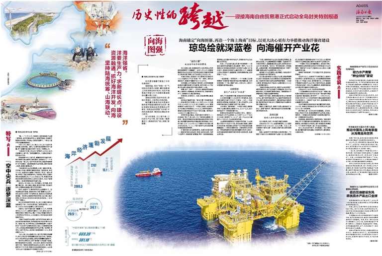 向海图强 坚持陆海统筹、山海联动、资源融通,抓好海洋开发,向海洋要生产力、求新增长点,建设海洋强省。 ■ 海南日报全媒体记者 周晓梦 如何激活蕴藏于蔚蓝之中的发展密码? 海南答案,写在“深海一号”气田跃动的蓝色火焰里,藏在临高海上风电场转动的叶轮间,也在洋浦港首次突破200万标箱的集装箱吞吐量中得以见证。 海南自贸港全岛封关在即,那海水湛蓝处,正澎湃出无限动能。 高质量发展海洋经济是更好服务海洋强国战略的政治任务、高标准建设海南自由贸易港的必然要求、发挥自由贸易港“先手棋”作用的战略选择、增进民生福祉的有力抓手。 如今的海南,正以海为卷,以科技与产业为笔,奋力绘就一幅更富活力、更具韧性的“海上海南”新图景。