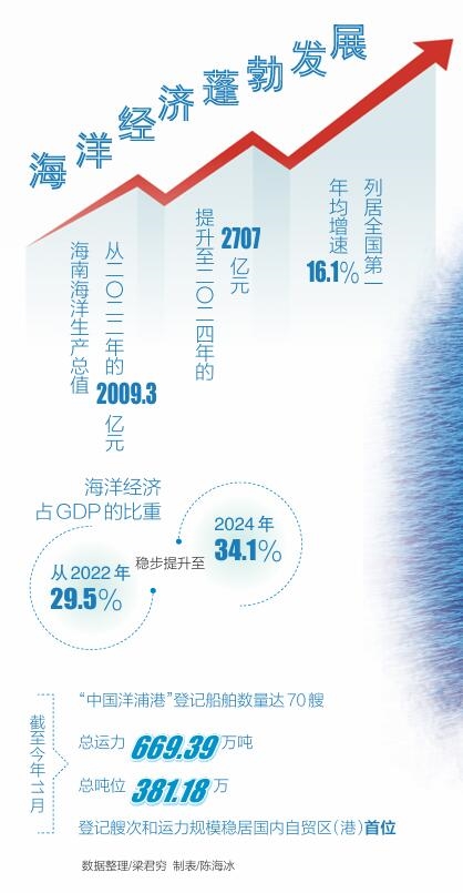 “深海一号”能源站(无人机照片)。新华社发(中国海油供图) “蓝色引擎” 我省海洋经济持续攀高 在三亚南山港,加速建设的公共科考码头托举起深海探索的“大国重器”。去年12月29日,我国首艘拥有完全自主知识产权的深远海多功能科学考察及文物考古船“探索三号”在此抵达,并正式入列; 在陵水海域,我国首个自主勘探开发建设的1500米超深水大气田“深海一号”一期和二期先后建成投产,高峰年产量提升至45亿立方米; 在洋浦港,内外贸航线不断加密,去年洋浦港集装箱吞吐量持续增长并创新高,首次突破200万标箱,同比增长显著,跻身中国主要港口20强; 首艘、首个、首次……近年来,海南坚持陆海统筹、山海联动、资源融通,抓好海洋开发,向海洋要生产力、求新增长点,建设海洋强省。 因海而生,依海而兴。当前,我省海洋事业彰显无限活力。 海洋经济蓬勃发展,“蓝色引擎”动能更强劲——我省海洋生产总值从2022年的2009.3亿元提升至2024年的2707亿元,较上年增长10.4%,增速显著高于全国平均水平。今年前三季度,全省海洋生产总值初步核算超过2000亿元,保持快速增长,增速在全国沿海省份中也处于领先位置。海洋经济占全省GDP比重达到35.5%。