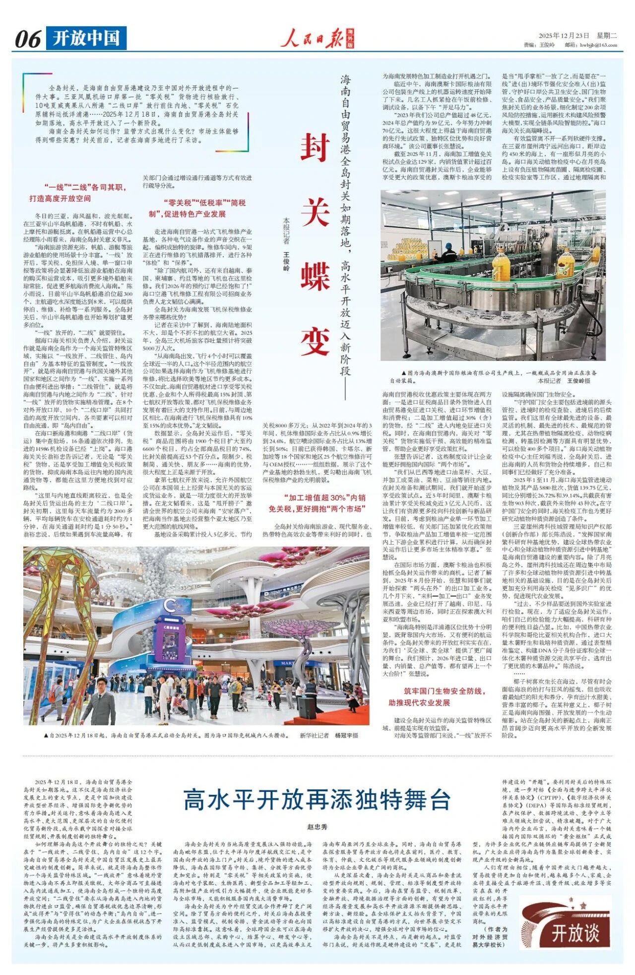 12月23日,人民日报海外版第06版刊发文章《海南自由贸易港全岛封关如期落地,高水平开放迈入新阶段——封关蝶变》,文章聚焦海南全岛封关如何运作、监管方式出现什么变化、市场主体能够得到哪些实惠等方面进行了解读。