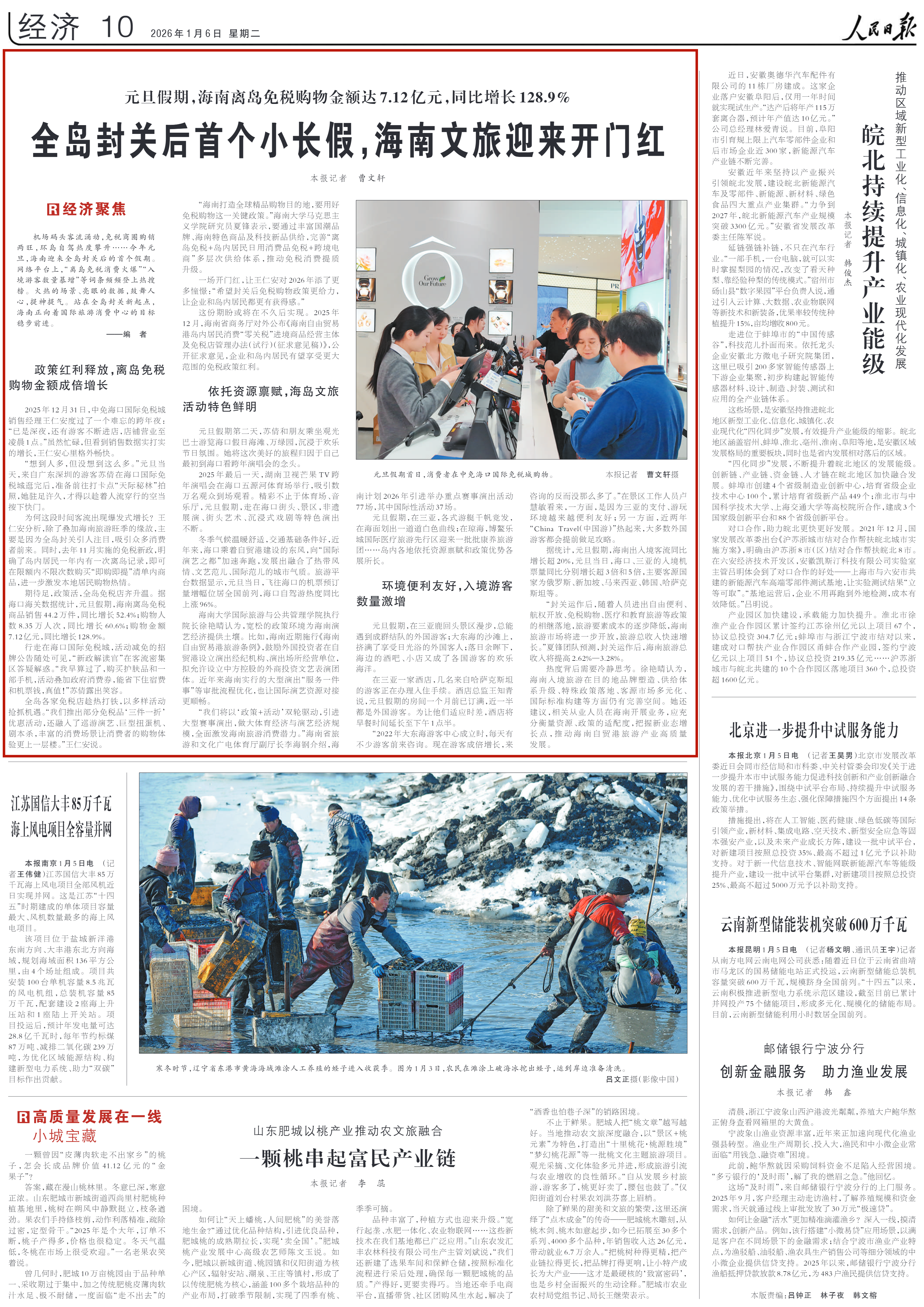 《人民日报》(2026年01月06日第10版) 机场码头客流涌动,免税商圈购销两旺,环岛自驾热度攀升……今年元旦,海南迎来全岛封关后的首个假期。网络平台上,“离岛免税消费火爆”“入境游客数量暴增”等词条频频登上热搜榜。火热的场景、亮眼的数据,鼓舞人心,提神提气。站在全岛封关新起点,海南正向着国际旅游消费中心的目标稳步前进。 ——编者 政策红利释放,离岛免税购物金额成倍增长 2025年12月31日,中免海口国际免税城销售经理王仁安度过了一个难忘的跨年夜:“已是深夜,还有游客不断进店,店铺营业至凌晨1点。”虽然忙碌,但看到销售数据实打实的增长,王仁安心里格外畅快。 “想到人多,但没想到这么多。”元旦当天,来自广东深圳的游客苏倩在海口国际免税城逛完后,准备前往打卡点“天际秘林”拍照,她驻足许久,才得以趁着人流穿行的空当按下快门。 为何这段时间客流出现爆发式增长?王仁安分析,除了叠加海南旅游旺季的缘故,主要是因为全岛封关引人注目,吸引众多消费者前来。同时,去年11月实施的免税新政,明确了岛内居民一年内有一次离岛记录,即可在限额内不限次数购买“即购即提”清单内商品,进一步激发本地居民购物热情。