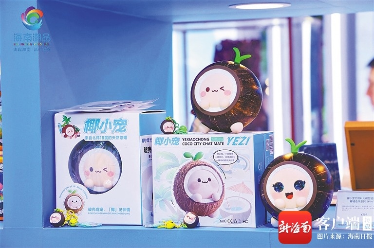含有黎锦纹样的手拎包。海南省文化投资管理有限公司供图 IP破圈 用创意讲好海南故事 在本届消博会上,首次揭牌的“海南潮品”文化区域公用品牌,集结了多种海南文创好物。 “‘海南潮品’只能说它是一个品牌,不属于一件产物,因为它融合了海南全省标志性的好的IP。”海南省文化投资管理有限公司负责人王永龙在接受采访时强调。他以海南长臂猿为例,“它是世界濒危动物,比咱们中国大熊猫还珍稀。像我们现在打造的这种动物IP,将来会有越来越多产品加入进来。” 品牌是抽象的,但展品是具体的。在“海南潮品”展区,人气最高的“明星”之一,是一个名叫“椰小宠”的AI交互机器人。 它的外壳由真实的椰壳制成,每一只的颜色、纹理、尺寸都独一无二。更吸引人的是它的“灵魂”——你拍打它、抚摸它,它会用眼神和表情做出高兴、悲伤、哭泣等反馈;你跟它聊天,它能回答关于海南的问题。